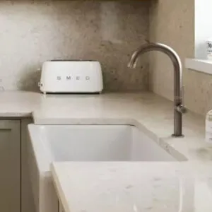 Just as the right countertops will upgrade your kitchen and bathrooms to no end, the perfect sink model with an eye-catching faucet can become an equally attractive design focal point and compliment to your countertops! Kitchen sinks provide function, organization, and space to complete our necessary routines, but our sink faucets become an extension of our favorite design aesthetic as well. Let’s explore different faucet designs, materials, tones, and finishes that will enhance the modern, contemporary, traditional, or farmhouse appeal you seek to achieve.